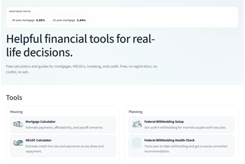 Helpful financial tools for real-life decisions. Free calculators and guides for mortgages, HELOCs, investing, and credit.