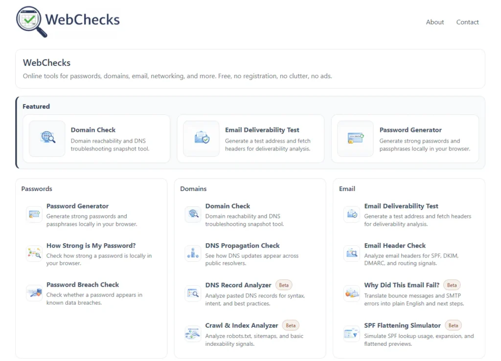 Online tools for passwords, domains, email, networking, and more. Free, no registration, no clutter, no ads.